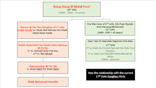 Naturally after Ngah Wahab the DPK was monopolized by Kulup Alang Yusuf’s family, from whom three of his sons – Cik Wan, Cik Tak and Mohamed Eusuff – became the twelfth (1905-1947), thirteenth (1947–1951) and fourteenth DPK (1951–1957) respectively. One of Kulup’s grandsons, Tawil Azhar bin Oneh Ahmad, also became the fifteenth DPK (1957-1980) before it passed to his elder brother’s great-grandson, Dato’ Seri Azizul Hassan, as the sixteenth DPK (1980–1999). The seventeenth and present DPK (1999 – current) is Dato’ Seri Dr Abdullah Fadzil bin Che Wan, who is also Kulup Alang Yusuf’s grandson.