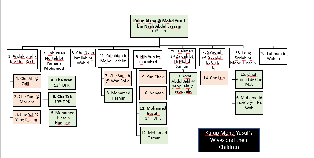 Ngah Wahab however left no male heir. Kulup Alang Yusuf, on the other hand, had nine wives and abundant potential heirs as candidates for the DPK. Alas, his first wife Andak Sindik also produced no male heirs. This was unfortunate given that all her children were Kulup’s eldest by virtue of her being the first wife. Of Andak Sindik’s three daughters, only Che Mariam had sixteen children. The other two daughters Che Zaliha (Che Ah) and Che Yang Kalsom (Che Yai) were childless. Che Ah and Yang Kalsom had adopted some of Che Mariam’s children.